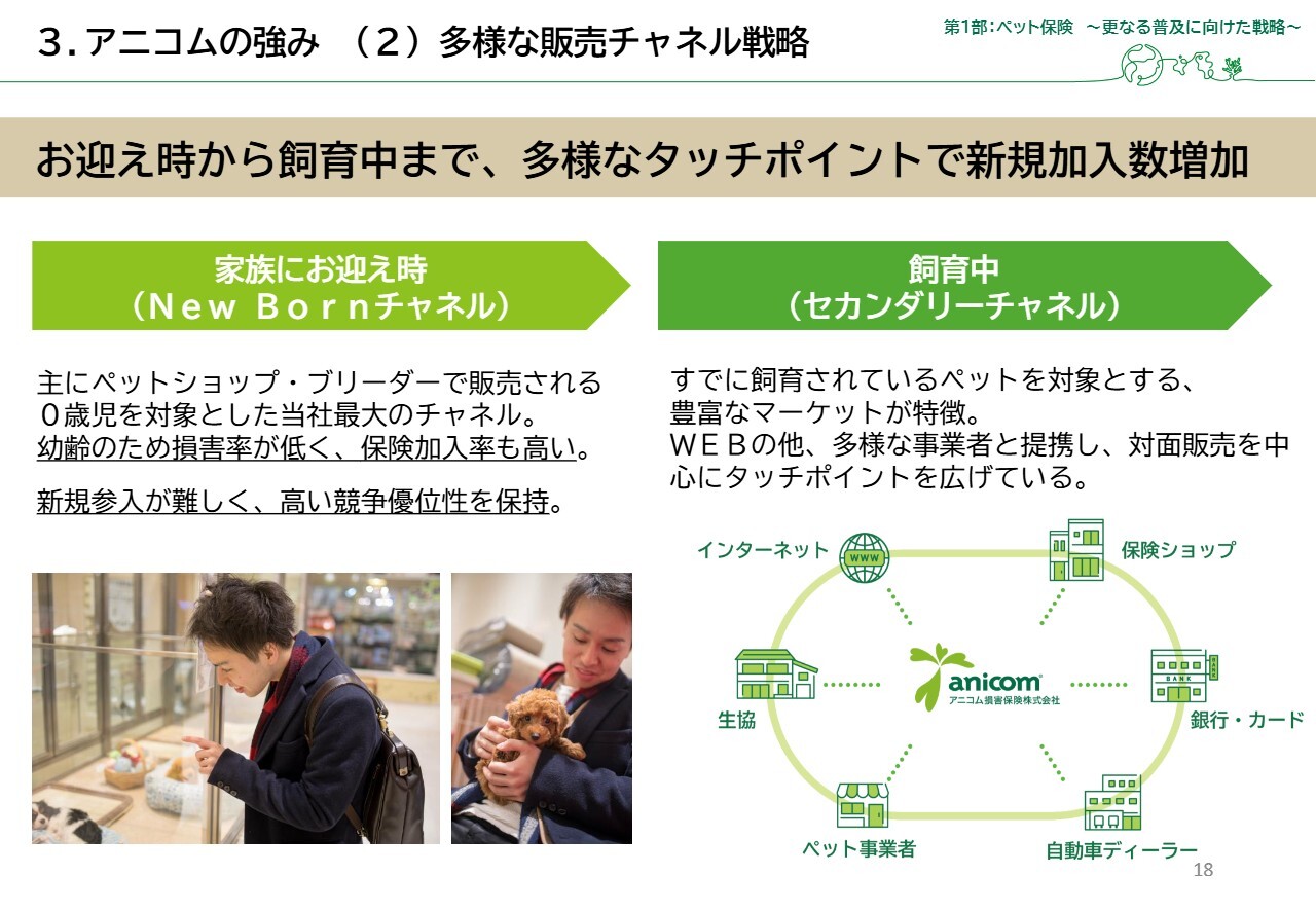1つ目は、ペットショップなどでワンちゃん・ネコちゃんを家族にお迎えするNew Bornチャネルです。2つ目は、すでにペットを飼っている方に対して、ペット保険をご案内させていただくセカンダリーチャネルです。