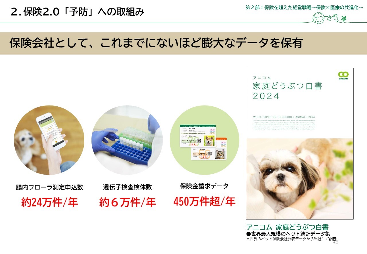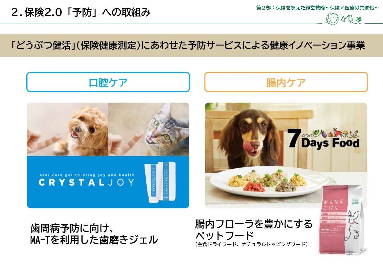 そのような場合に、我々のフードケア商品をご提案して、今、多くの飼い主さまにお試しいただいている状況です。今後も、予防を実現する健康イノベーション事業として、商品のラインナップを増やし、保険の健診と予防ケアが循環する仕組みを拡大していきたいと考えています。