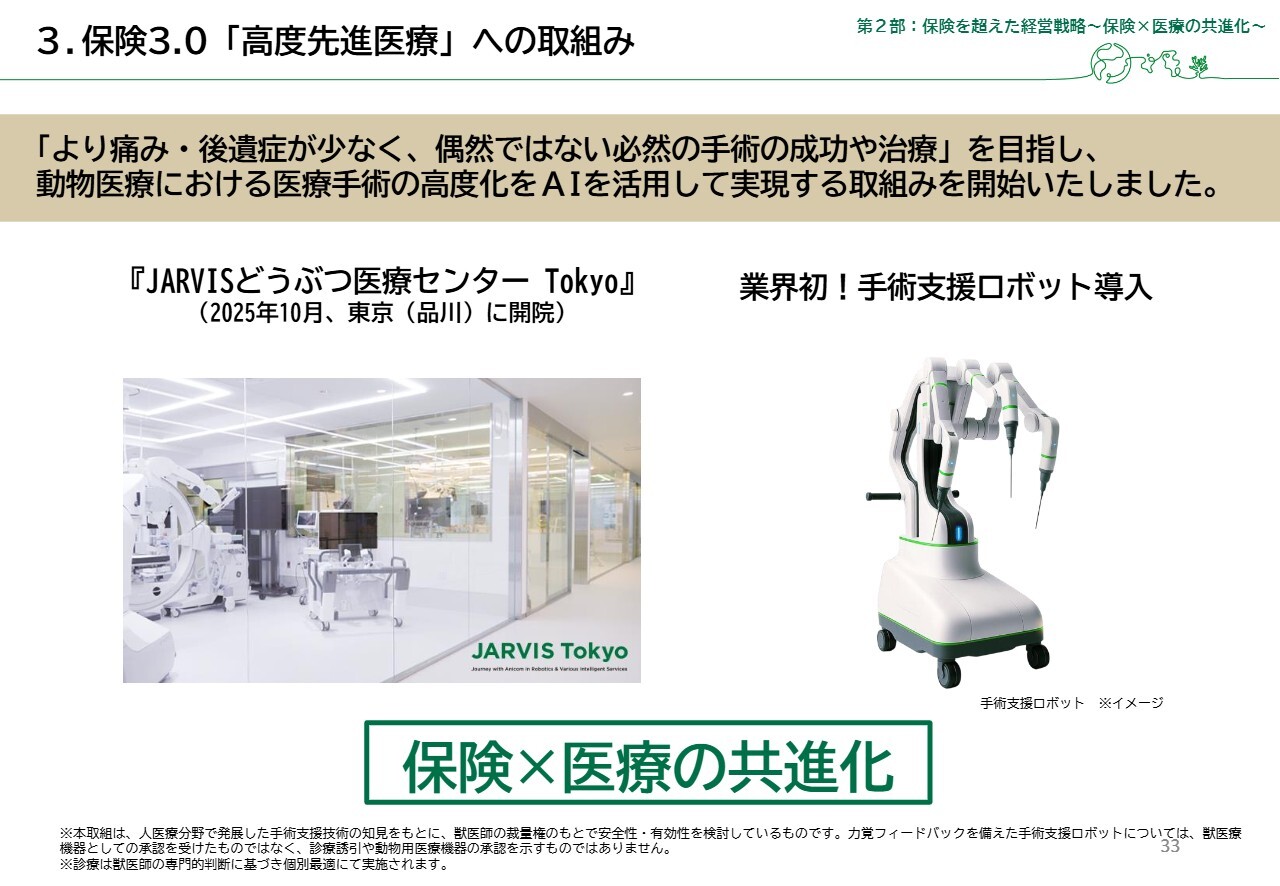 野田:保険3.0における医療への取組みとして、東京の品川に、高度医療専門施設である「JARVISどうぶつ医療センター Tokyo」を開院しました。国内で初めて、おそらく世界でもほとんど初だと思いますが、動物医療に手術支援ロボットを導入しています。