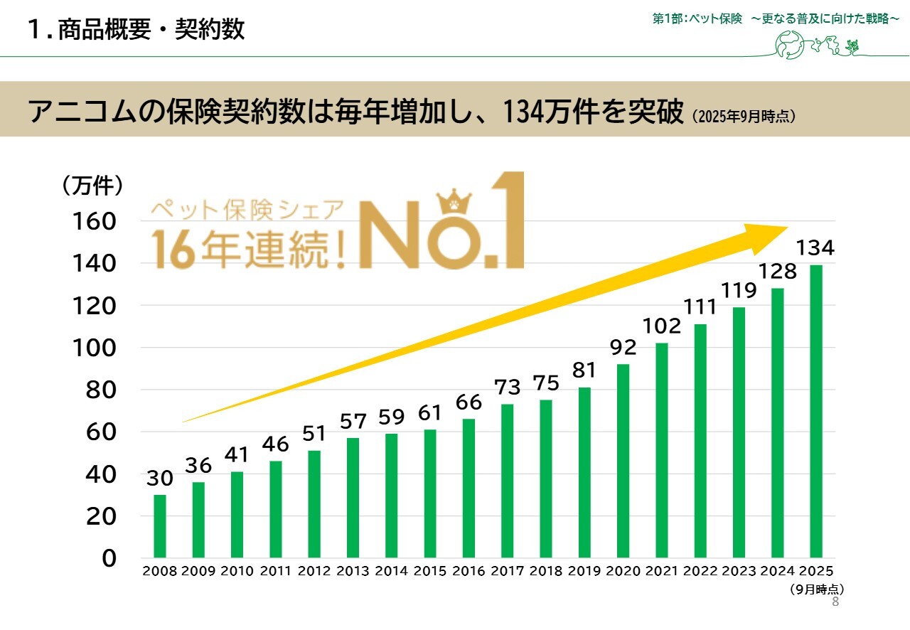 野田:アニコムの契約数です。おかげさまで保険契約数は毎年増加しており、直近で134万件を突破しました。これは、ペット保険業界No.1の契約数です。