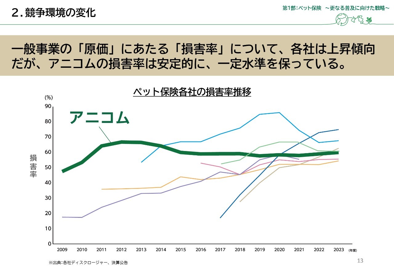 野田:競合他社の状況をご説明しましたが、その中でアニコムのシェアは4割以上を占めています。2番手の会社を含めるとシェア7割となります。ペット保険市場は、実はこの2社で寡占しているような状況です。