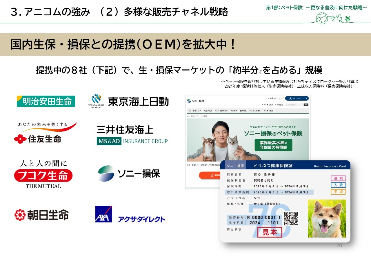 野田:もう1つの販売チャネルについてご説明します。国内の生命保険会社や損害保険会社との提携も拡大しています。スライドをご覧のとおり、ソニー損保にアニコムのペット保険を商品提供して、11月4日から「ソニー損保のペット保険」として販売を開始していただいています。