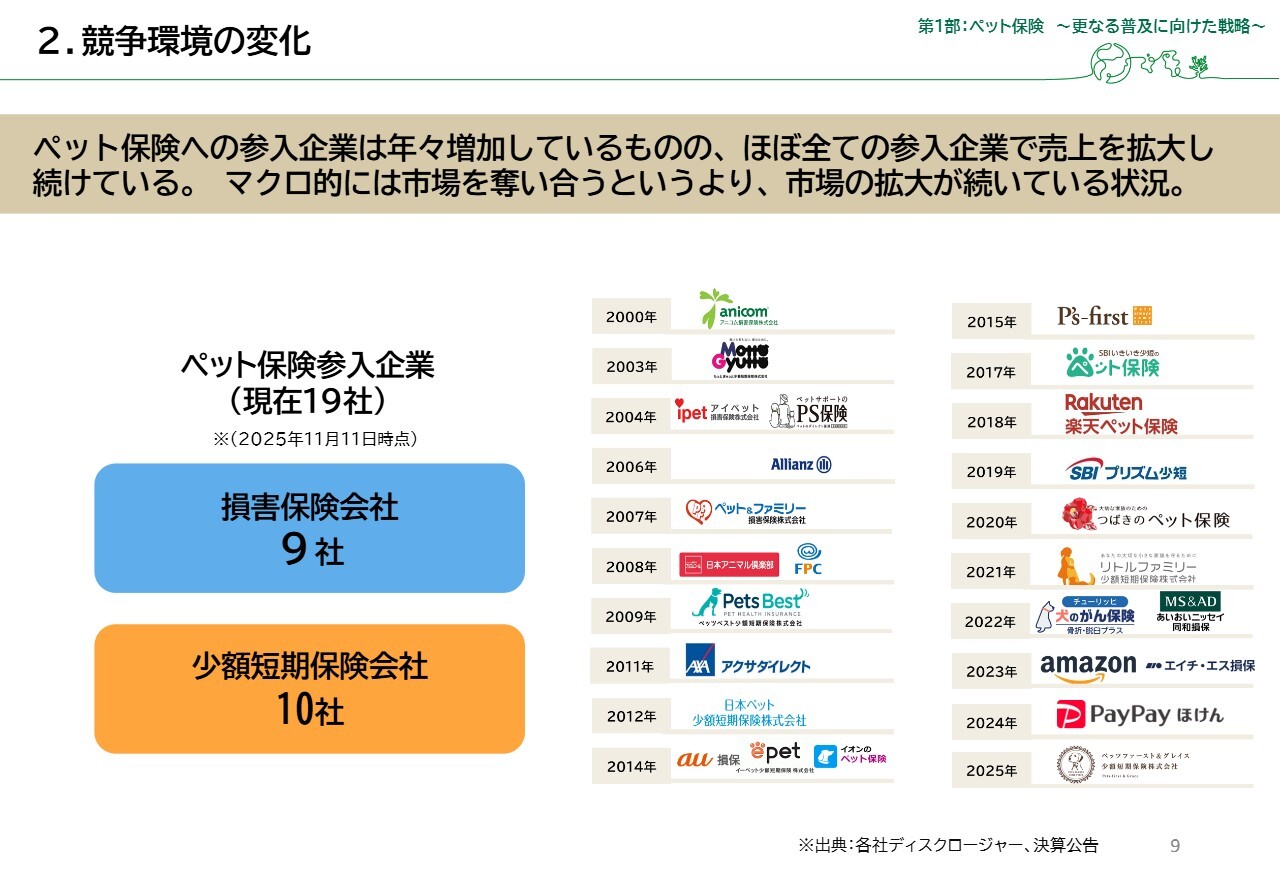 野田:ペット保険の市場規模です。参入企業は毎年増加していますが、ほぼすべての参入企業が売上を拡大し続けています。したがって、マクロ的には市場を奪い合うというよりも市場の拡大が続いています。