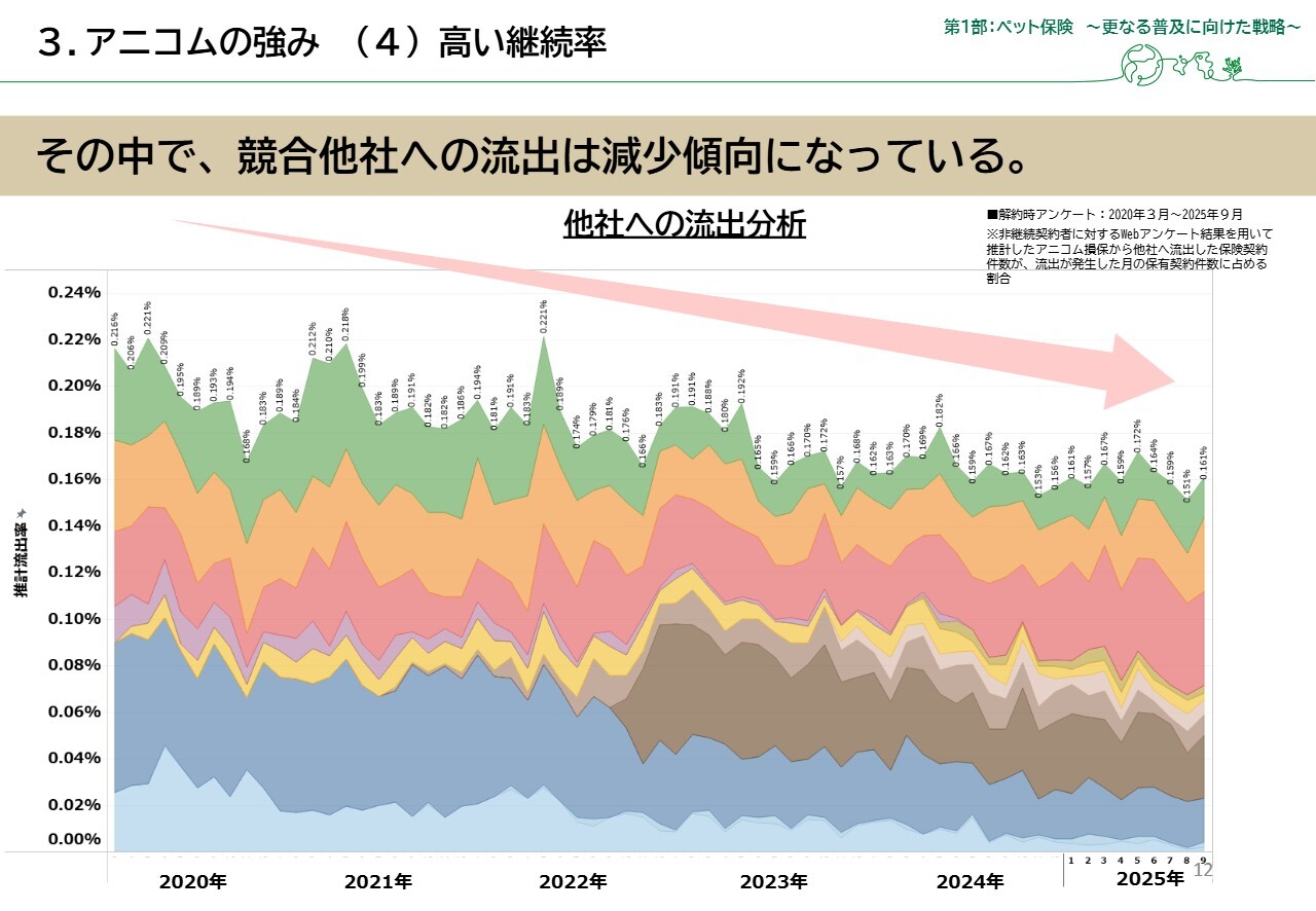 野田:スライドは、競合他社への流出率の資料です。実際に、アニコムをやめて他社に流出するお客さまは一定数います。しかし、我々も継続して調査していますが、競合が参入し続けているにもかかわらず、他社への流出率は増加するどころか、明らかに減少する傾向になっています。