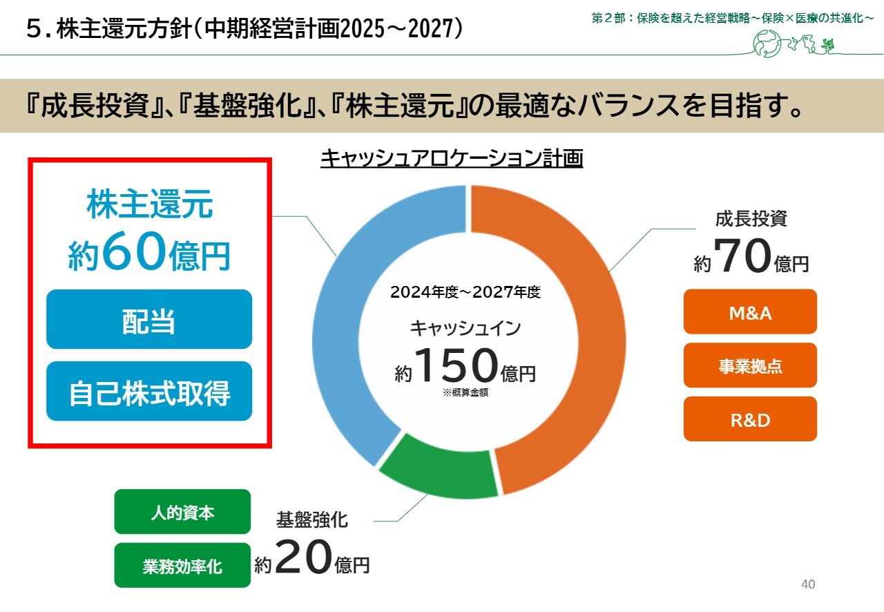 野田:株主還元についてご説明します。株主の方にも、配当や自社株式取得を通じて、しっかりと還元していきたいと考えています。