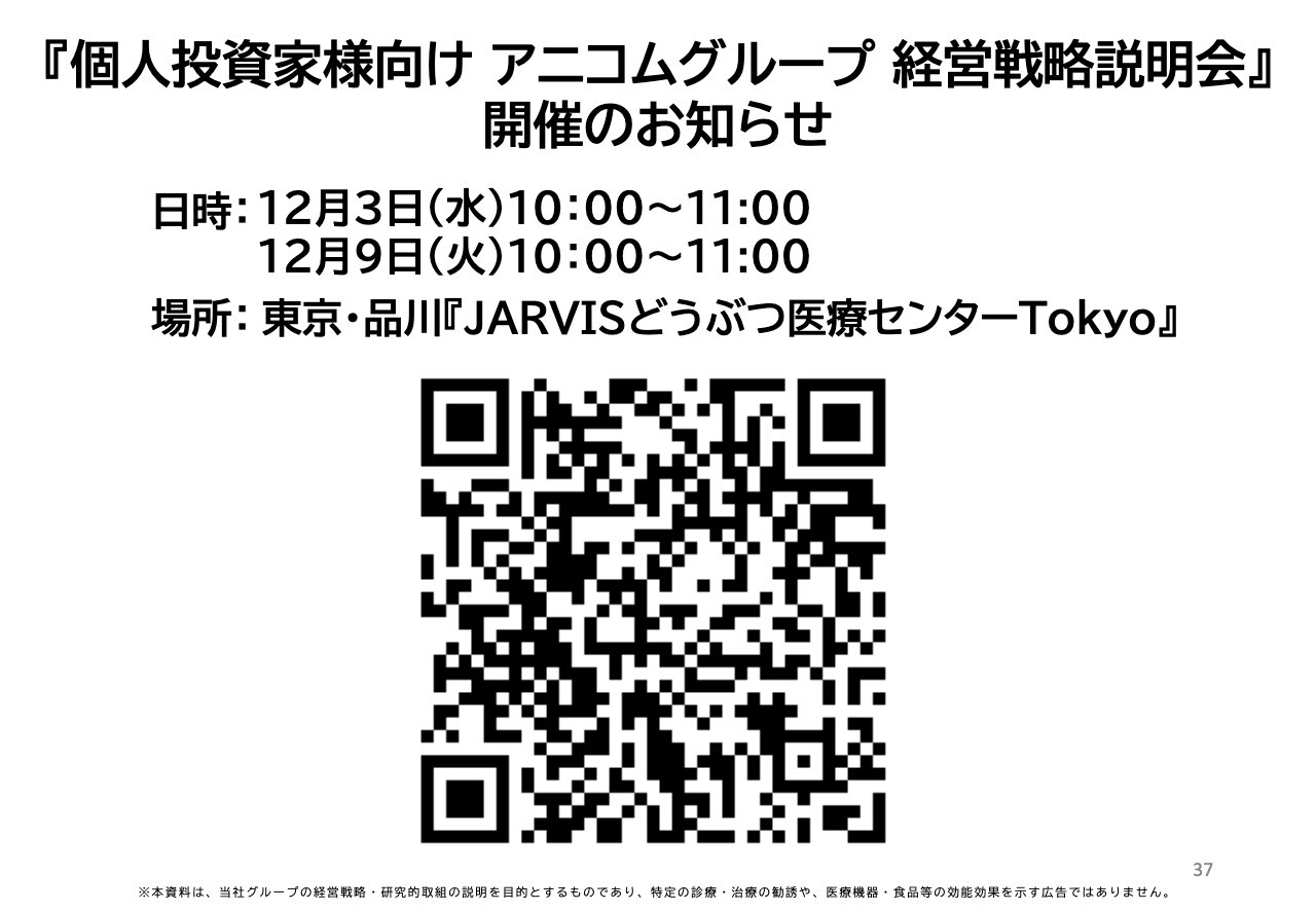野田:個人投資家向けに品川の医療施設にて、12月3日(水)10:00-11:00、12月9日(火)10:00-11:00に経営戦略説明会を開催します。スライドのQRコードは申し込みフォーマットになっていますので、QRコードを読み込んでご覧いただくか、アニコム ホールディングスのホームページからお申し込みください。