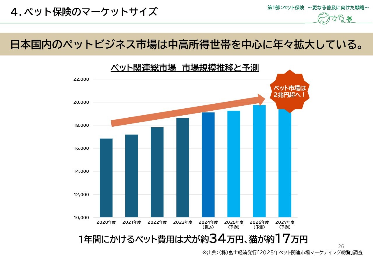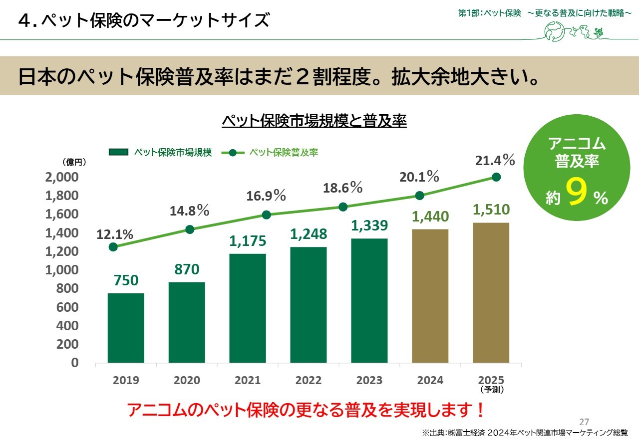 回答:市場全体の普及率は将来的に30パーセント以上が見込めると考えており、ペットが家族として認識され医療・予防への意識が高まる中、当社は予防型保険や先進医療のカバーなど一歩進んだ価値提供を強化することで、飼い主のみなさまに「保険に入っていて良かった」と感じていただけるサービスを追求し、市場拡大をリードしていきます。