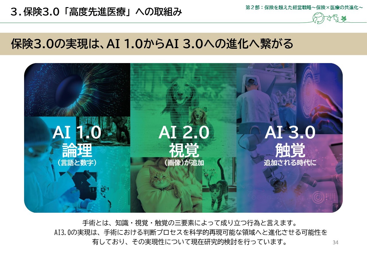 野田:今後は、医療分野でもAIの活用が欠かせないと考えています。AIの進化は、AI 1.0の論理的思考から、AI 2.0の視覚を経て、AI 3.0の触覚まで発展すると考えられています。論理・視覚・触覚は手術に必要な要素であり、AIが医療手術を進化させる可能性は十分に高いと考えています。