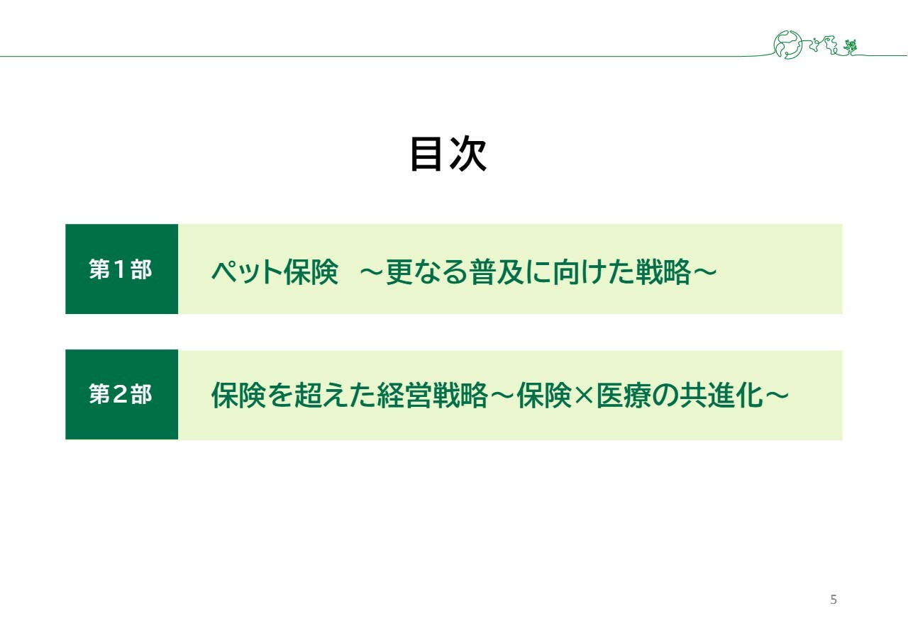 野田:目次です。第1部でペット保険に関する拡大戦略や、ペット保険市場における立ち位置などについてご説明します。この第1部で、少し時間をかけてお話ししたいと思います。