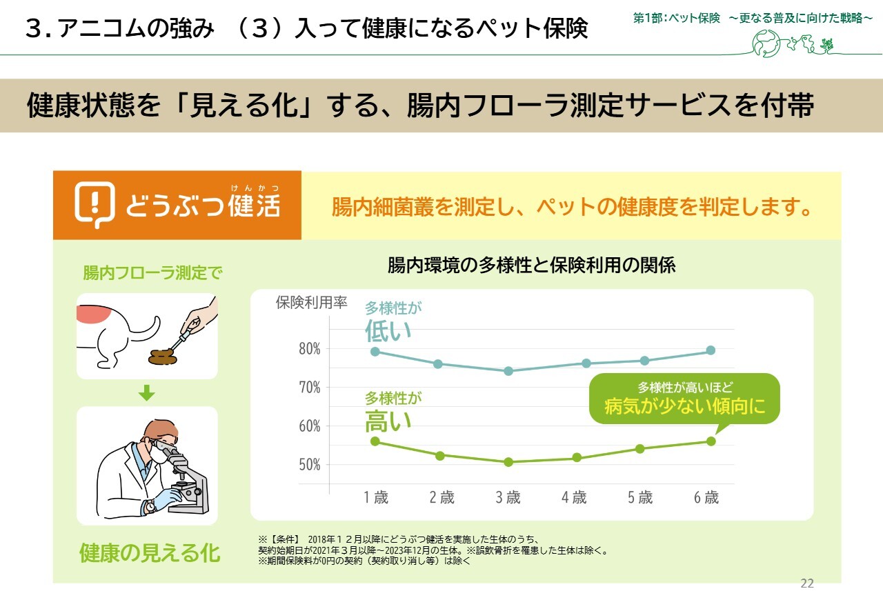 野田:ペット保険のサービスとして、健康状態を見える化する「腸内フローラ測定サービス」を、保険に無料付帯しています。