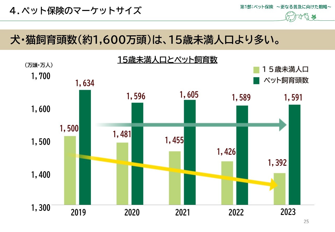 野田:ここからは、ペット保険の市場規模についてお話しします。スライドのグラフは、ワンちゃん・ネコちゃんの飼育頭数と、15歳未満人口との比較です。
