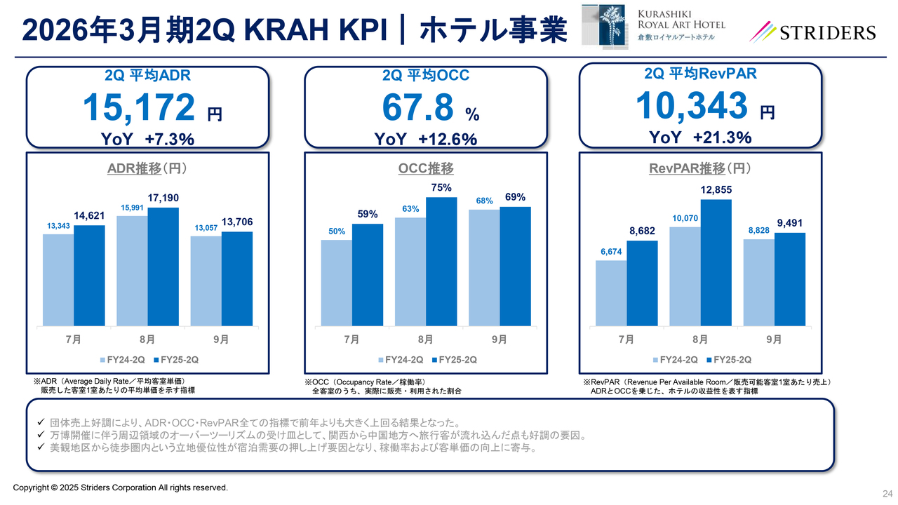 早川:倉敷ロイヤルアートホテルに関しても、ADRが1万5,172円、平均OCCが67.8パーセント、平均RevPARが1万343円となりました。こちらは前年同期比21.3パーセント増と、大きく改善できたと思っています。