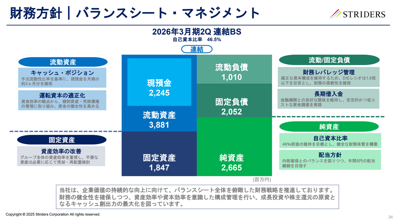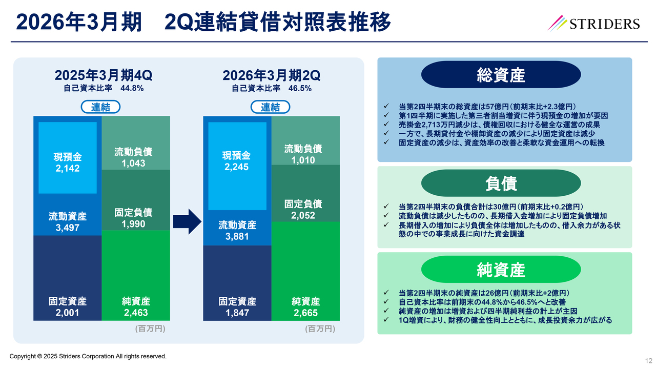 早川:バランスシートです。増資の効果で現預金が増加しており、手元流動性がさらに厚くなりました。また純資産も、増資と当期純利益の計上によって増加しています。その結果として、自己資本比率は44.8パーセントから46.5パーセントと伸びている状況です。