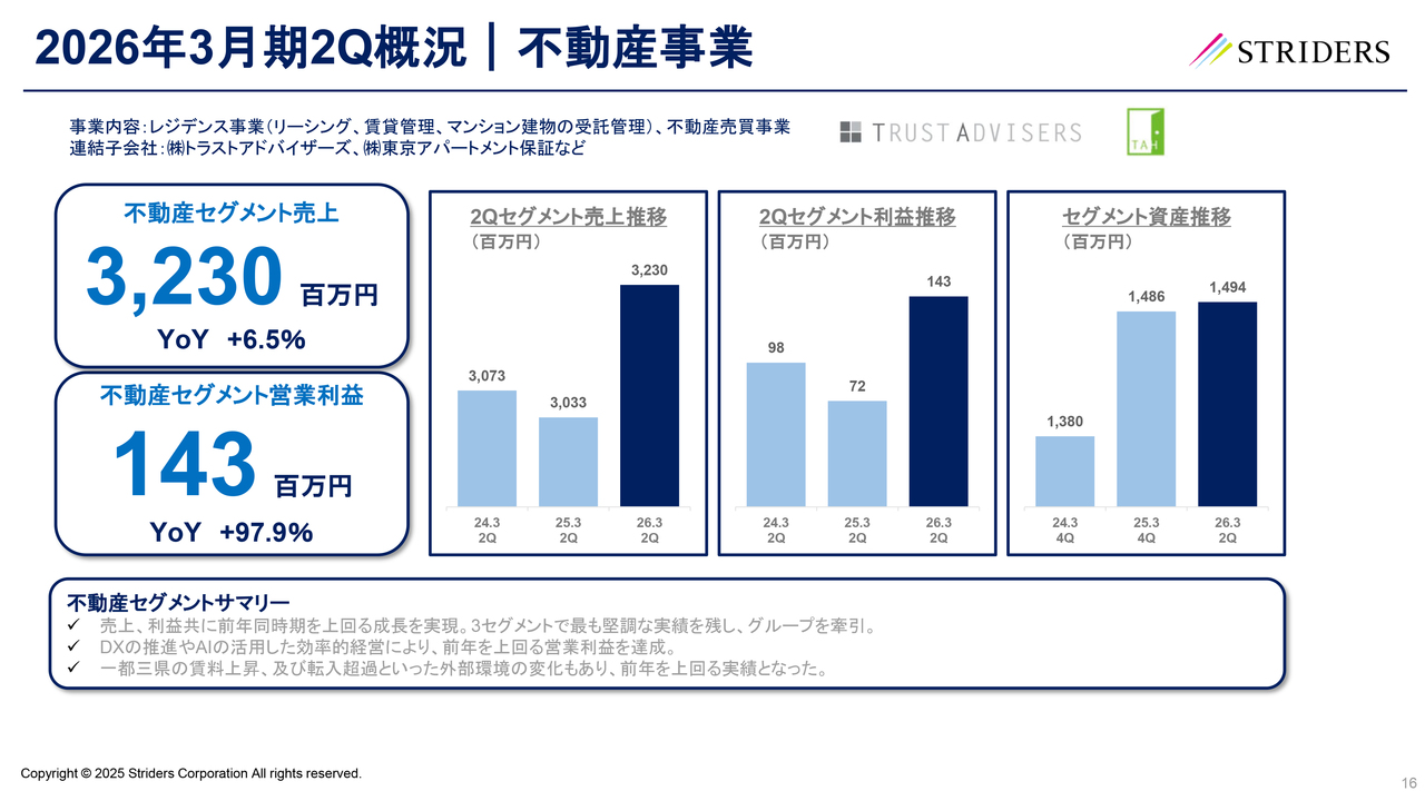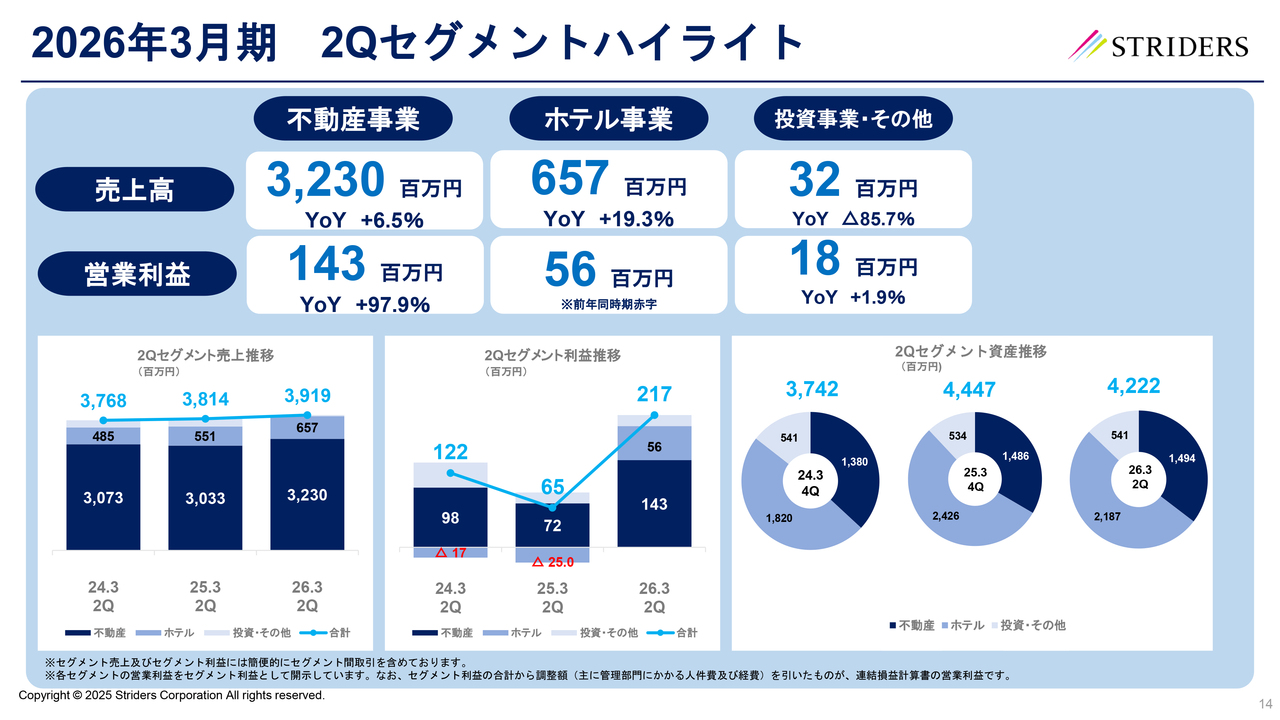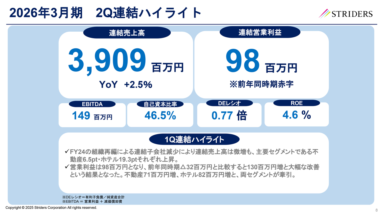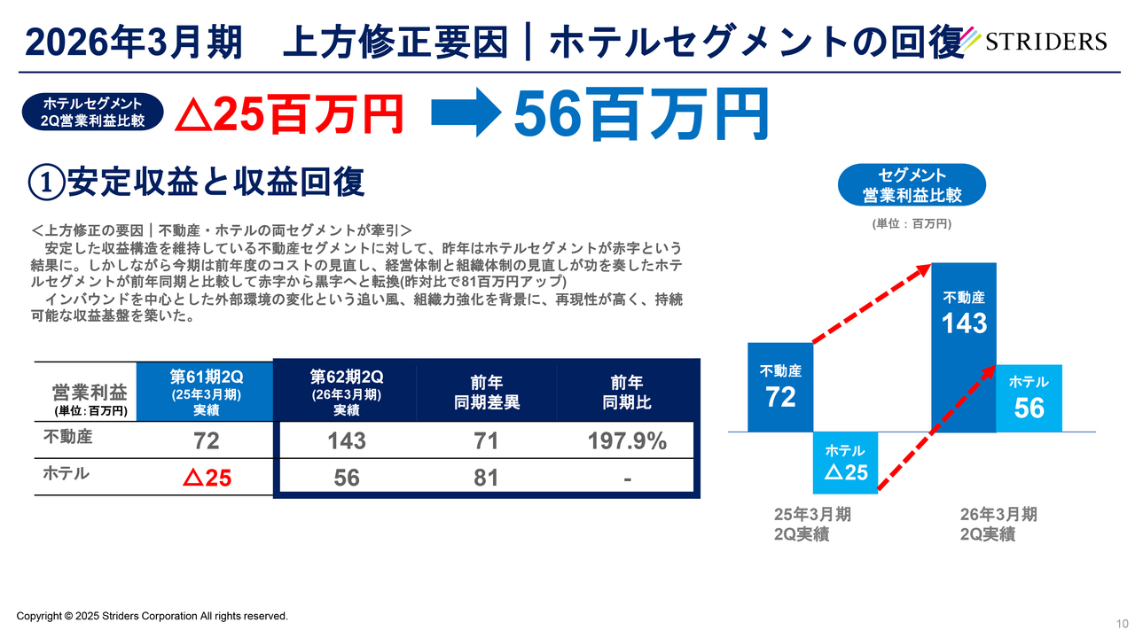 【QAあり】ストライダーズ、業績予想を上方修正 不動産セグメントとホテルセグメントの牽引により連結営業利益が前年赤字から黒字転換