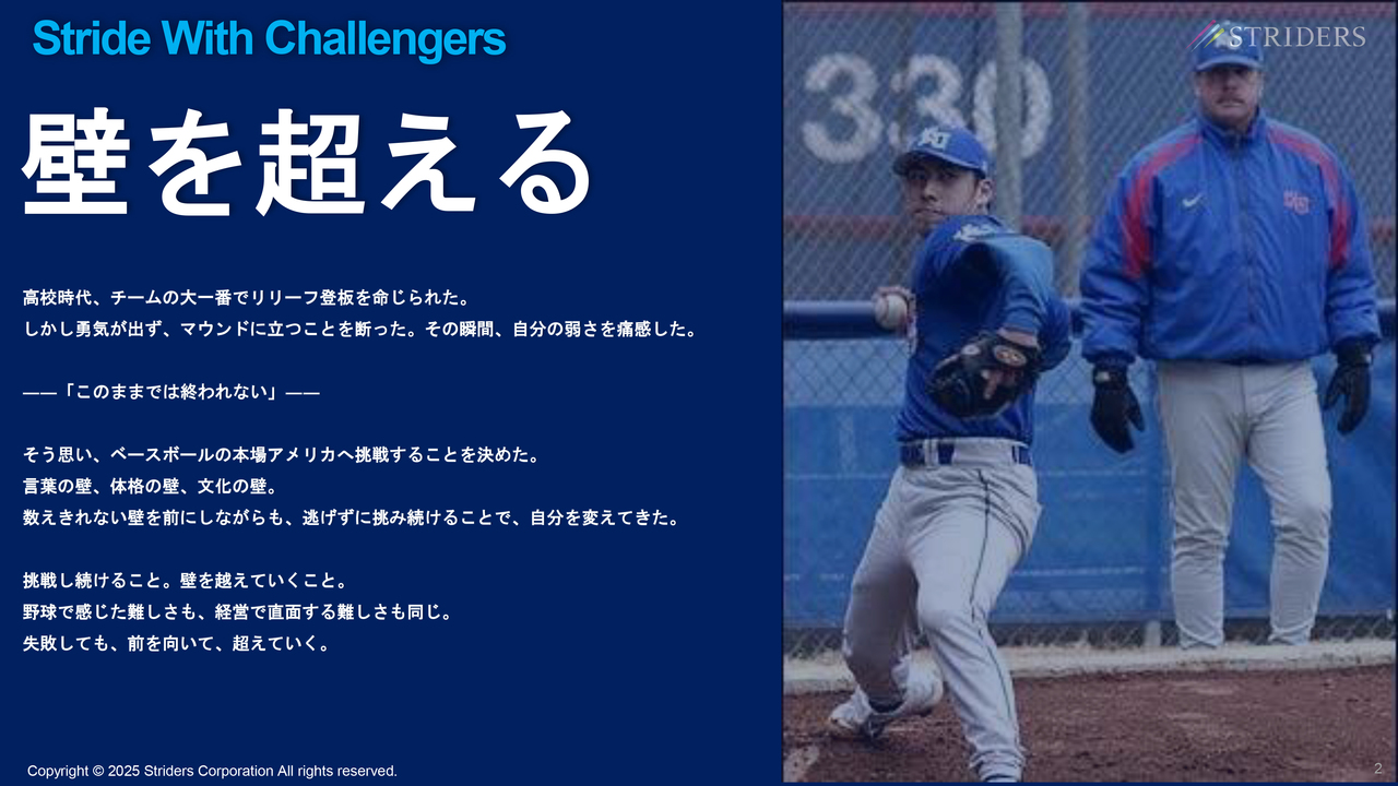 リーグ戦では現役の大リーガーとも対戦することもでき、中西部のリーグ優勝を経て全米大会に出場したという経験は私の財産であり、この挑戦の結果だと思っています。今は、挑戦することの喜びや感動を、社員やステークホルダーのみなさまとともに分かち合いたいと、日々経営に邁進しています。