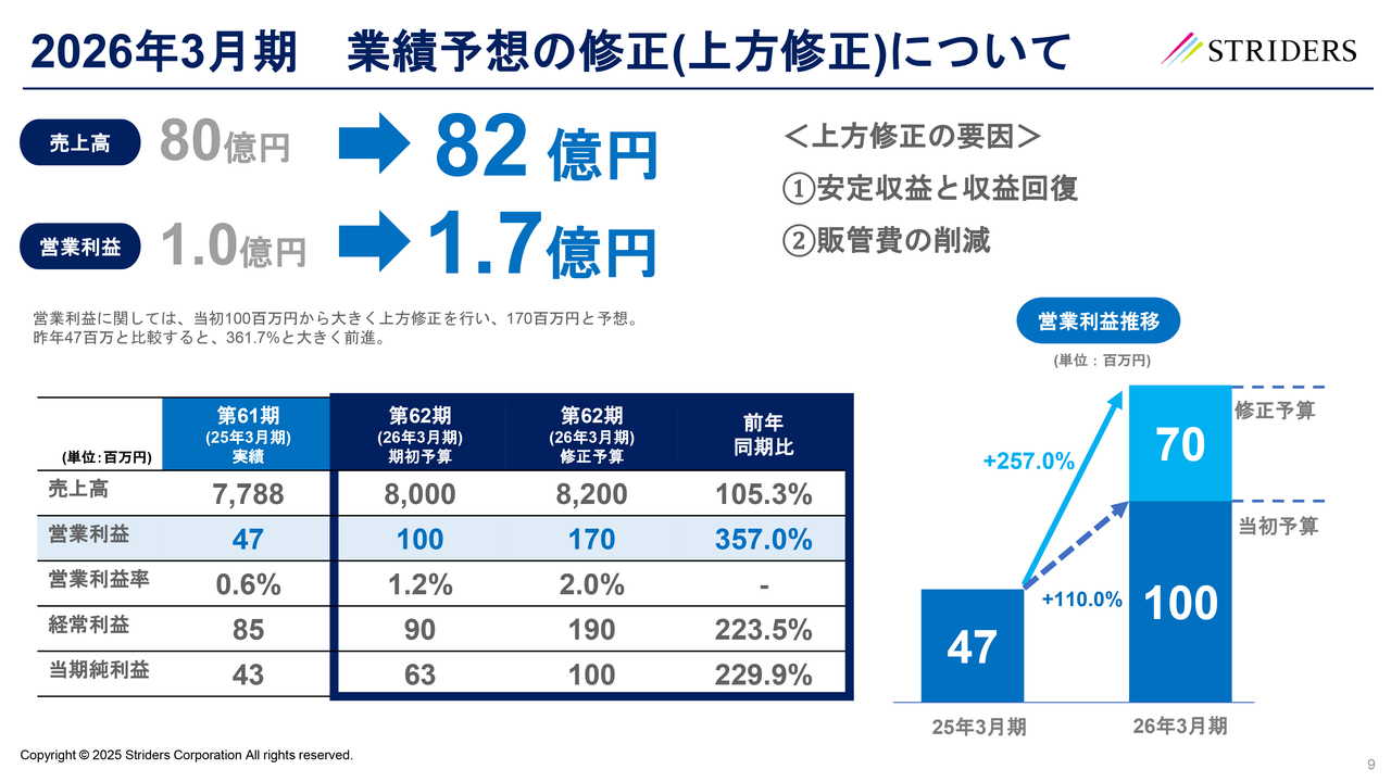 早川:業績予想の修正についてご説明します。売上高は期初に発表した80億円から82億円、営業利益は1億円から1億7,000万円と上方修正しました。