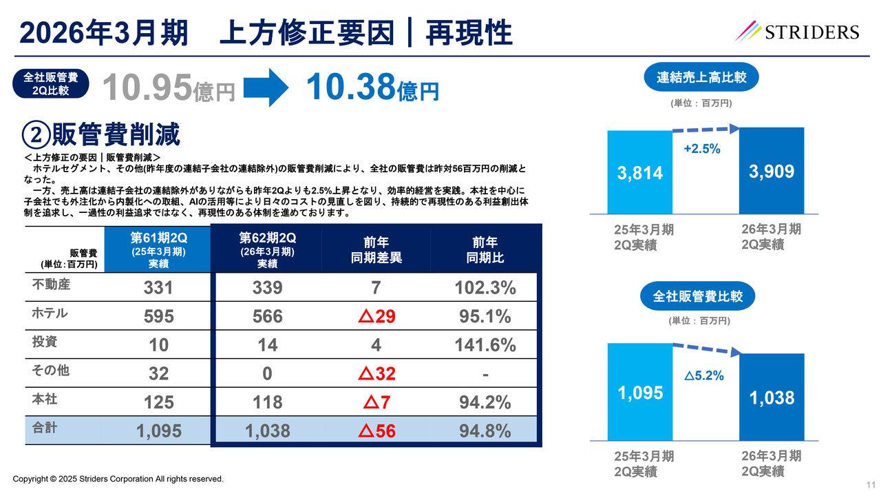 早川:上方修正の再現性です。販管費も努力した結果、不動産セグメントとホテルセグメントにおいて、大きく減少できたと思っています。特に不動産・ホテル・本社において、外注業務の内製化やAIを活用した業務の効率化などを行い、グループ全体で取り組みを進めています。