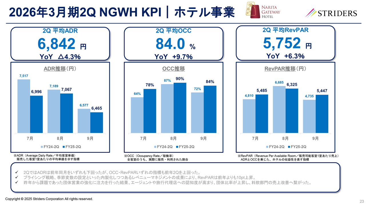 早川:成田ゲートウェイホテルのKPIです。スライドに示すとおり、平均ADR(客室単価)が6,842円、平均OCC(稼働率)が84パーセントで、両方を掛け合わせた平均RevPAR(販売可能客室1室当たり売上)が5,752円となりました。前年同期比で6.3パーセントの改善となっています。