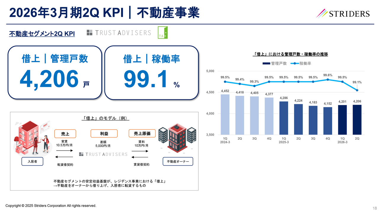早川:不動産事業では借上の管理戸数、稼働率が高水準を維持しています。特に稼働率は、スライド右側のグラフに示すとおり、99パーセント台で推移しています。このように、都内の物件を安定的に管理していることがおわかりいただけると思います。