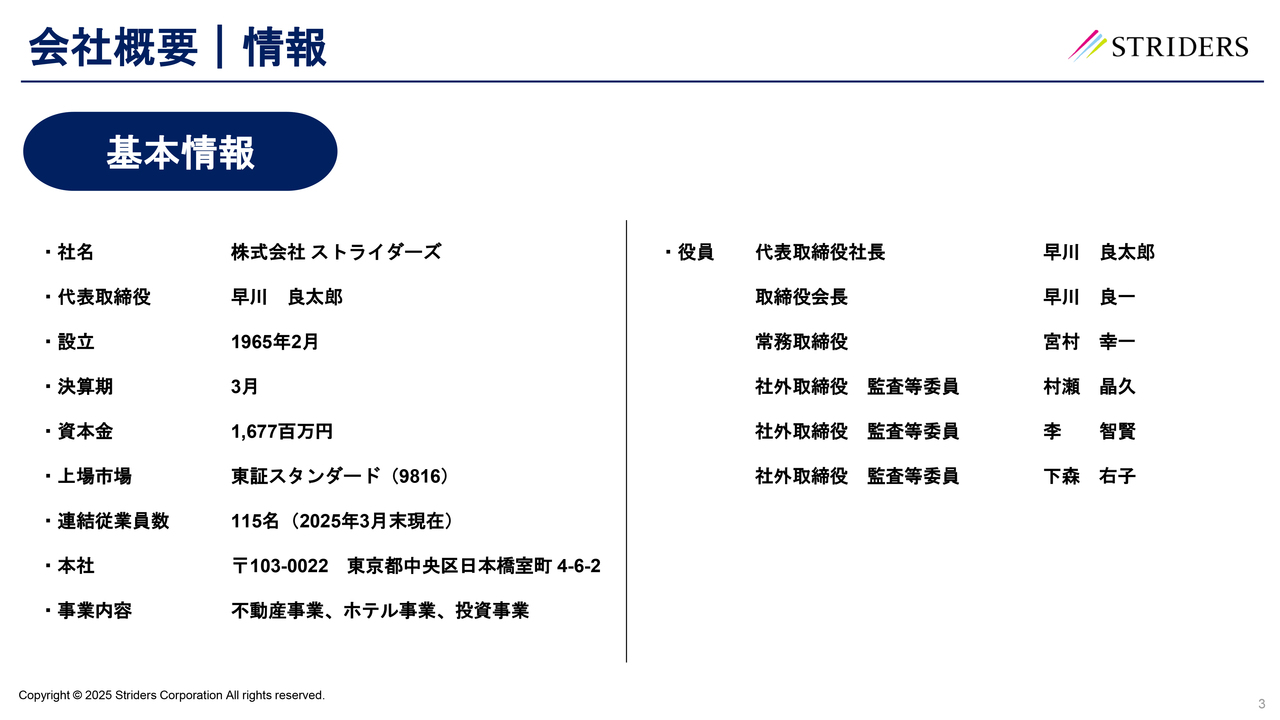 早川:会社概要です。ストライダーズは、コロナ禍が明けてからさまざまな変革を続けてきました。2026年3月期は、まさに挑戦と変革を軸に新たなスタートを切った年となっています。
