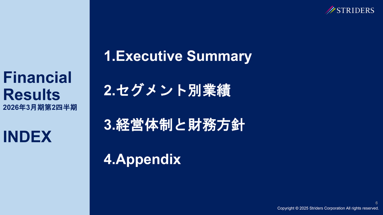 早川良太郎氏(以下、早川):みなさま、本日はお集まりいただきまして、ありがとうございます。株式会社ストライダーズ代表取締役社長の早川良太郎です。本日の第2四半期決算説明会では、業績および業績予想の上方修正、各セグメントの取り組みと成長戦略についてご説明します。