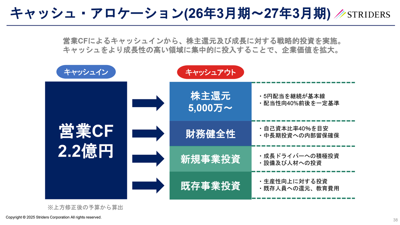 早川:キャッシュ・アロケーションについて簡単にご説明します。営業キャッシュフローの2億2,000万円を原資として、株主還元、財務の健全性の維持、成長投資の3つのバランスを取って、適切に配分していきたいと思っています。