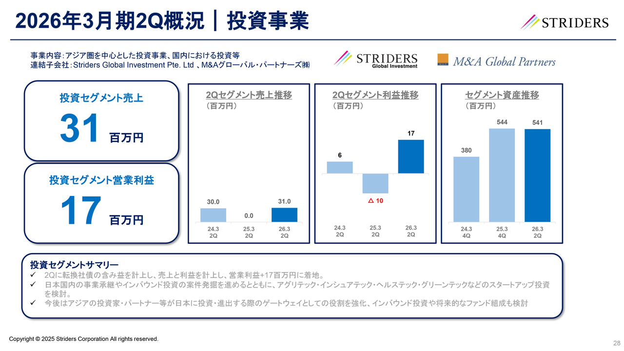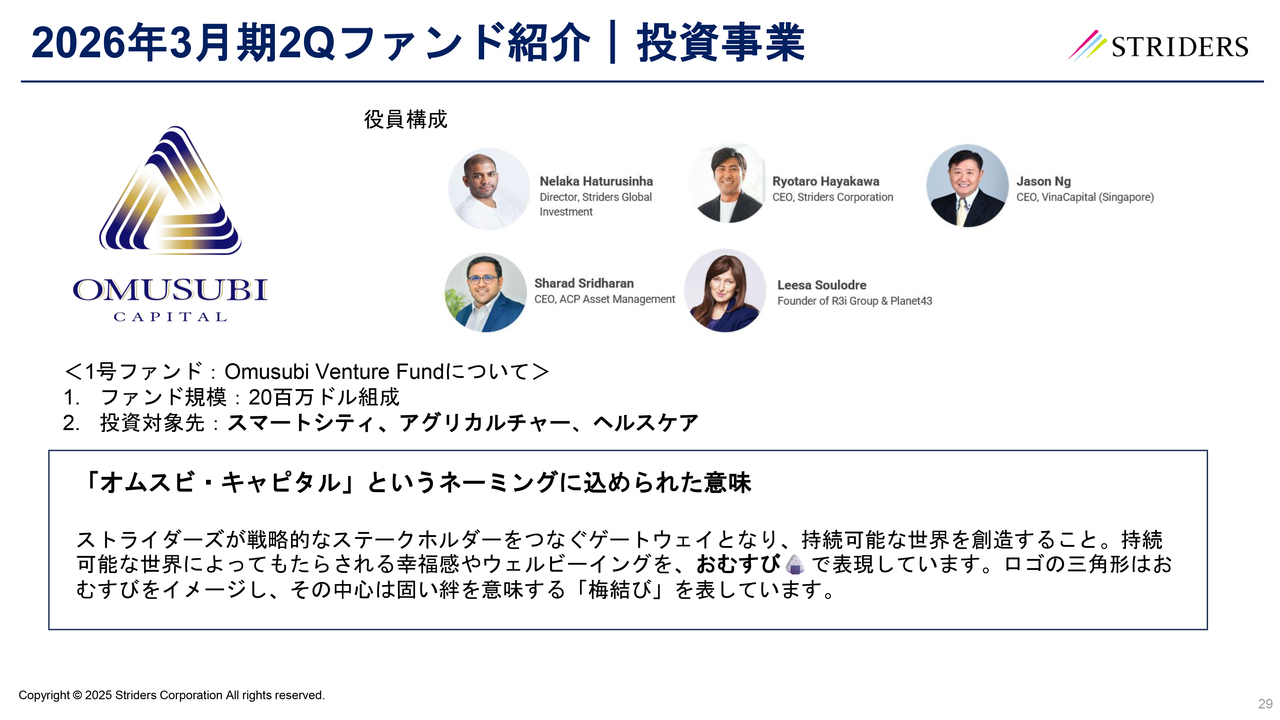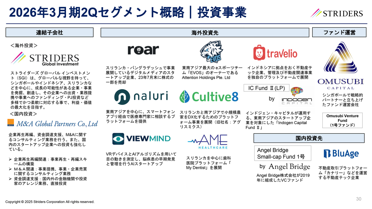 3つ目は「日本とアジアをつなげる」をテーマに、Striders Global Investmentと、M&Aグローバル・パートナーズが投資ファンド運営事業を展開している投資事業です。