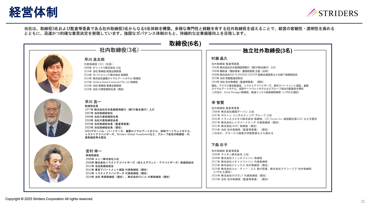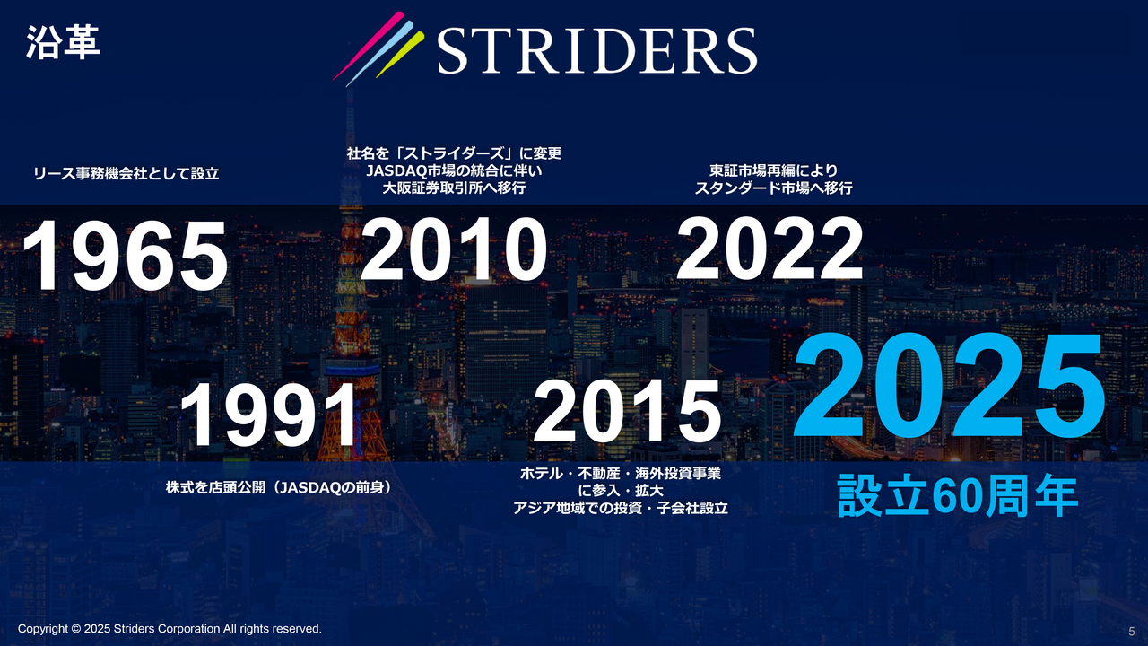 早川:ストライダーズの沿革です。1965年にリース事務会社として創業、設立されました。2025年に設立60周年を迎えています。