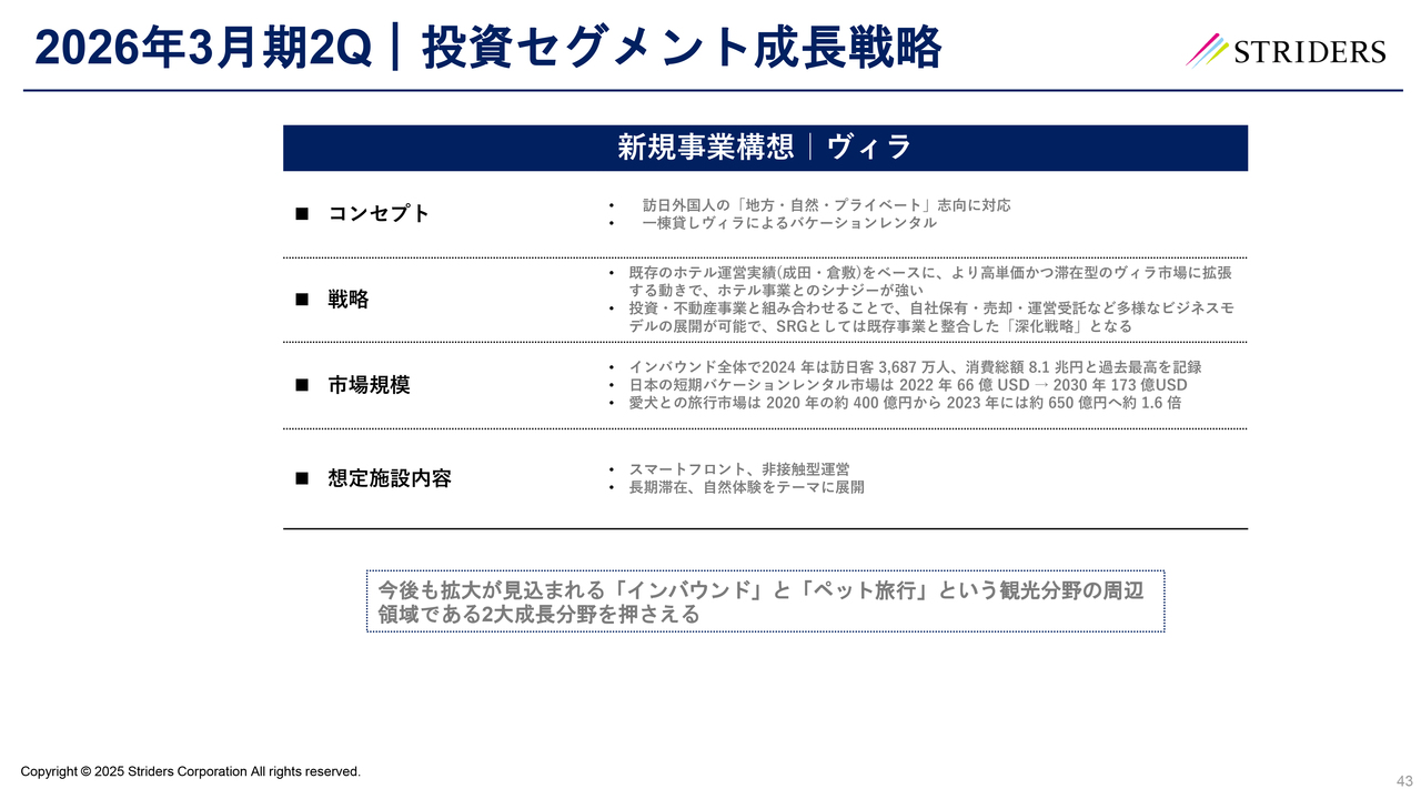 早川:投資セグメントの成長戦略です。第1四半期の時にもご説明したのですが、インバウンドやペット旅行という観光分野は、今後もさらなる拡大が見込まれている成長産業だと思っています。この2大成長分野をターゲットにウェルネスヴィラ事業を進めています。