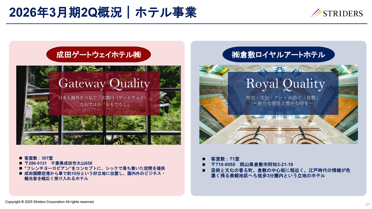 早川:ホテル事業の成田ゲートウェイホテルと倉敷ロイヤルアートホテルについてご説明します。成田ゲートウェイホテルは、客室数が307部屋で、もともと30年前に藤田観光が建てたホテルです。ヨーロピアン基調の館内が特徴で、スライド写真のとおり日本庭園もあるということで、ヨーロッパと日本が融合したようなホテルになっています。空港から10分のロケーションも人気です。