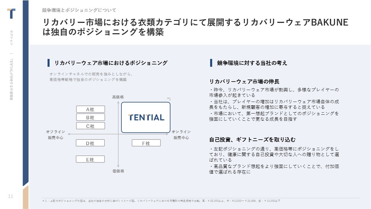中西:市場全体が大きく成長する観点ではポジティブに捉えており、「リカバリーウェア」という単語や認知が広がっていくことは、非常にポジティブに捉えています。その中でも当社がしっかり信頼されるポジショニング、すなわち高価格帯でも商品を選んでいただけるポジショニングをいかに維持し続けるかが、非常に重要なポイントになってくると考えています。
