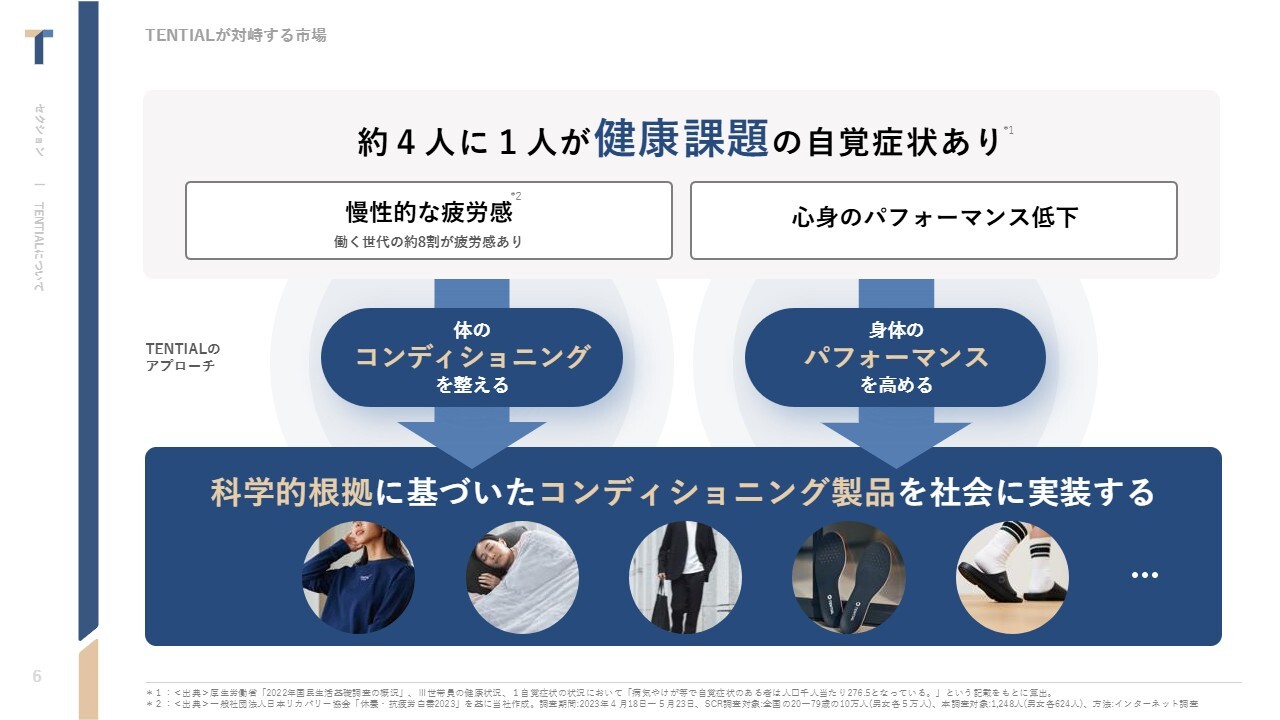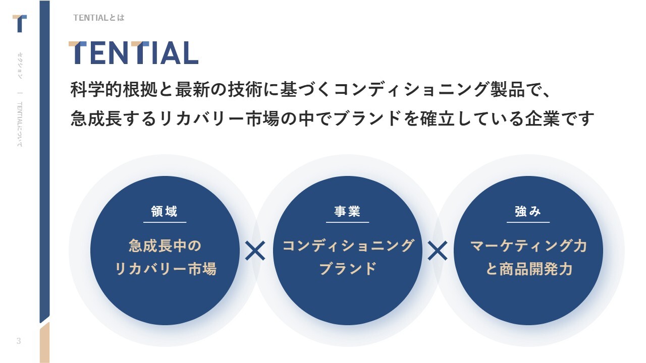 中西:株式会社TENTIALについてです。TENTIALは、科学的根拠と最新の技術に基づくコンディショニング製品で、急成長するリカバリー市場の中でブランドを確立している企業です。