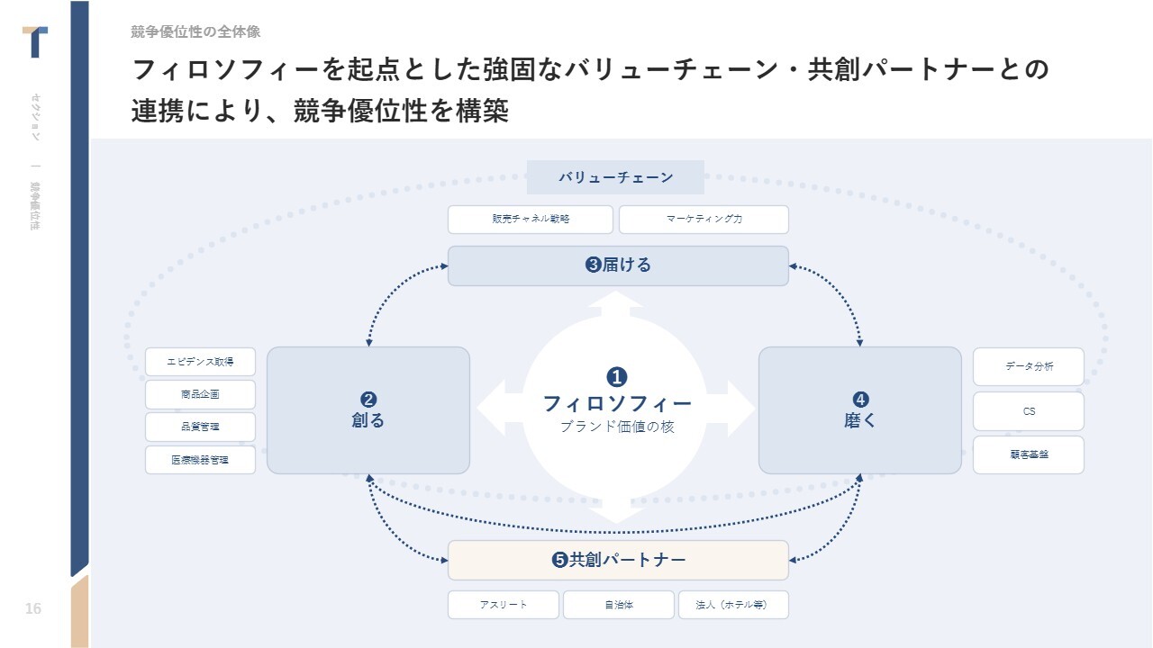 中西:あらためて、TENTIALが他の会社と何が違うのかをスライドの図でご説明します。当社はブランドとしてのフィロソフィーを非常に大切にしています。フィロソフィーでは、なぜ「TENTIAL」というブランドが立ち上がったのか、何を軸にして商品開発やマーケティング活動をしていくのかというコアをしっかり定めています。