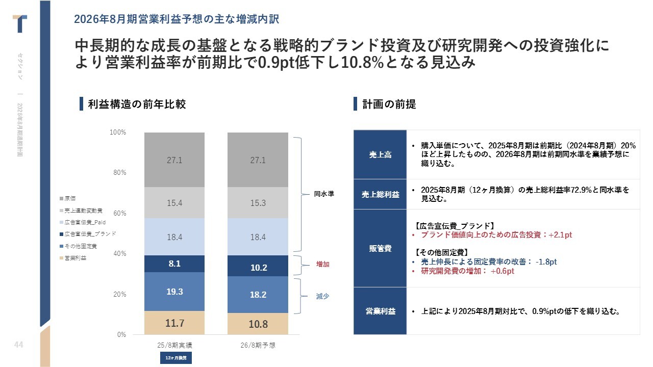 中西:各計画の構成比についてご説明します。大きなポイントは販管費です。ブランド投資として、広告費を前期比で2.1パーセント強化しています。また、研究開発費は前期比で0.6パーセント強化しています。良い商品を創っていくための研究開発費を強化していることが、営業利益率低下の要因となっています。