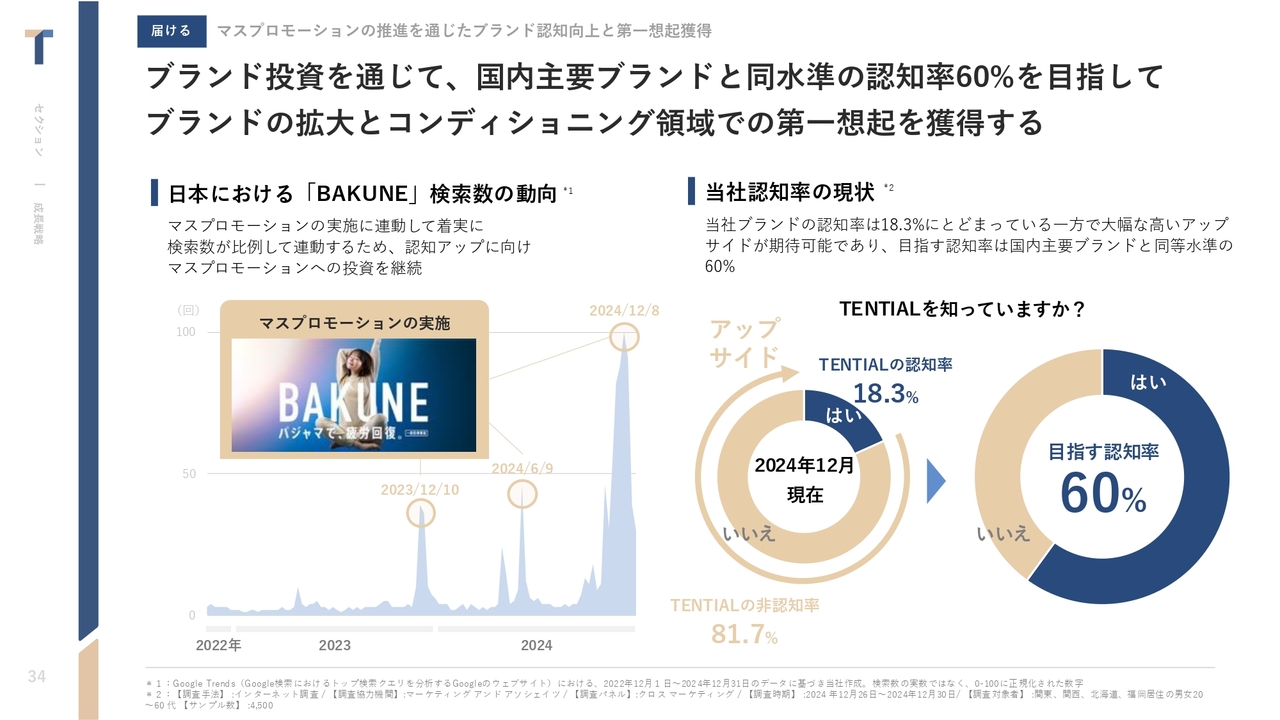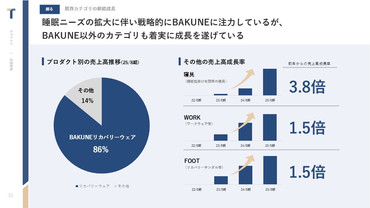 昨今、リカバリーウェアはメディアを含めて認知が広がっているため、認知率はもう少し高まっている可能性がありますが、成長のアップサイドはまだあると捉えています。まずは、「BAKUNE」の市場シェアNo.1をより強固なものにしていきます。