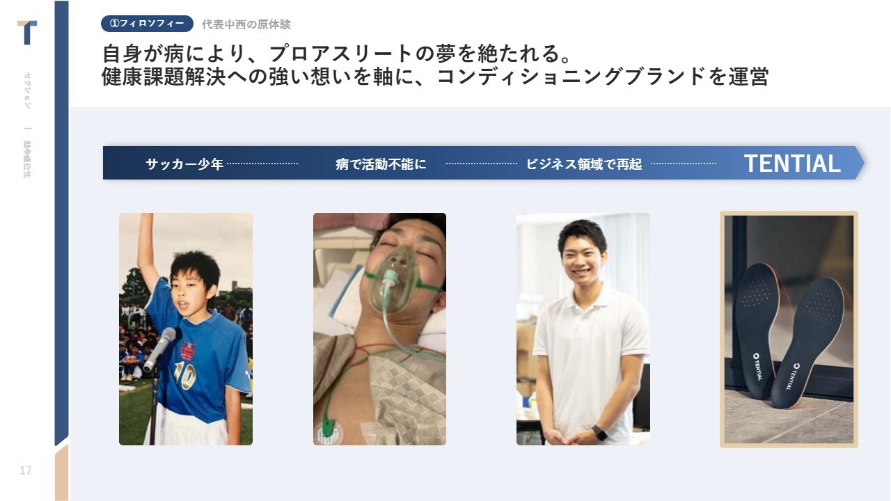中西:フィロソフィーを具体的かつ簡単にご説明するために、私がTENTIALという会社を創業した背景、「TENTIAL」ブランドをスタートさせた背景についてお話しします。もともと私自身はサッカー選手を目指していましたが、たまたま病によって挑戦することができなくなってしまったという背景があります。