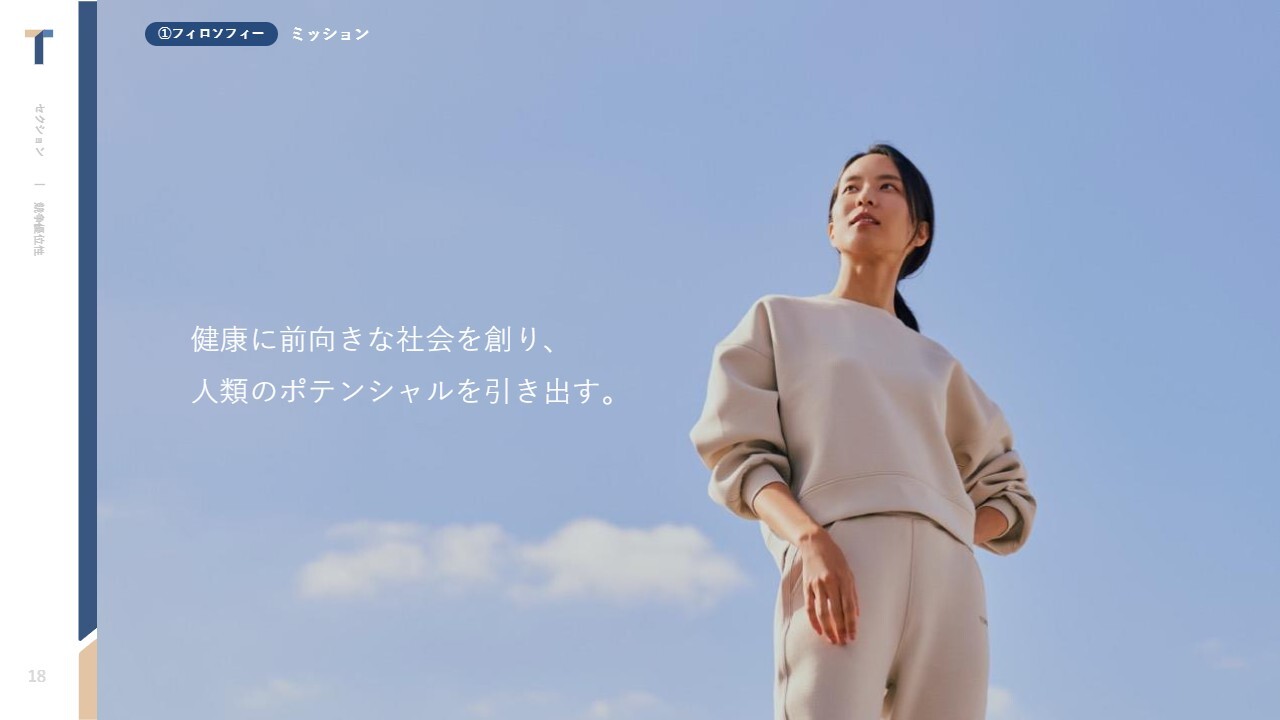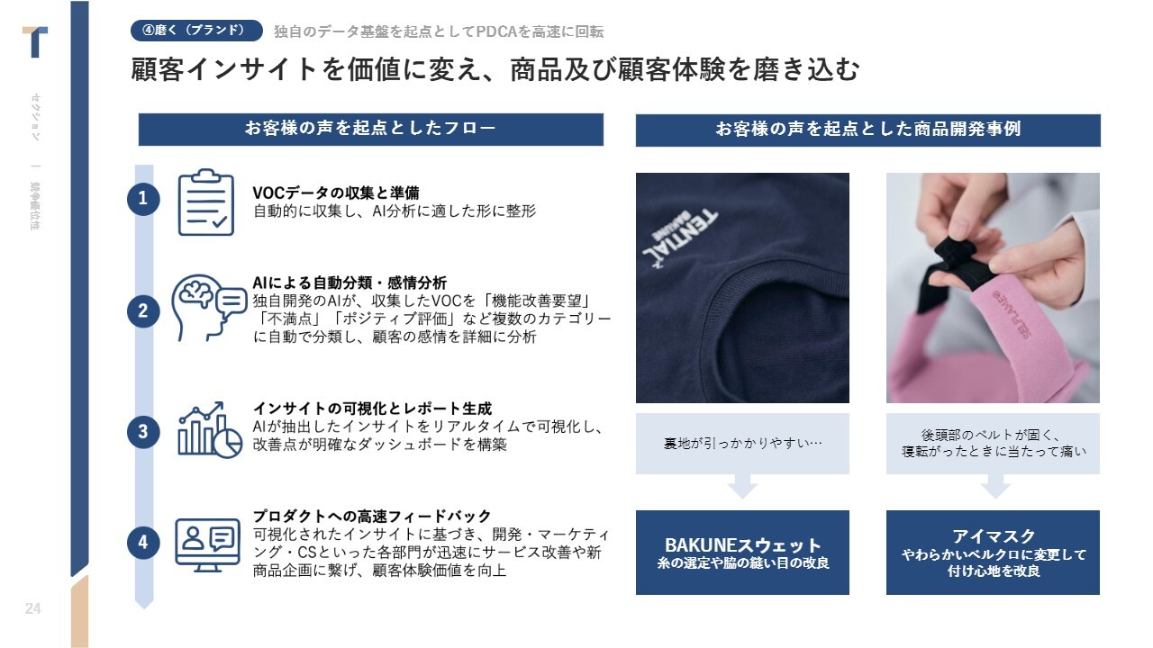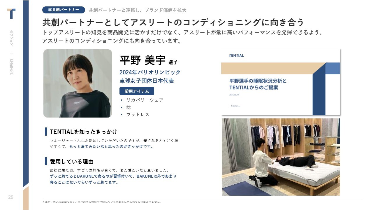 スライドに表示しているとおり、ただ商品を創るだけではなく、アスリートが困っていること、たとえば睡眠などを当社のアセットやナレッジで解決できないかと日々向き合っています。