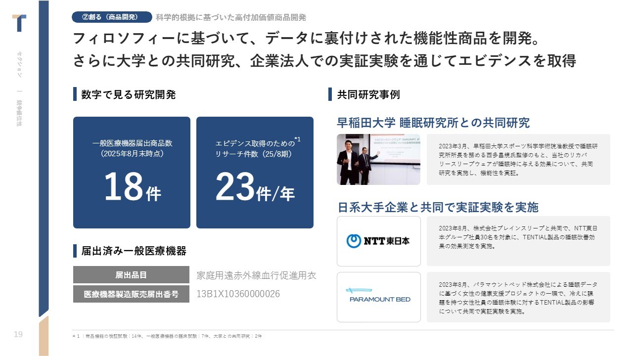 中西:だからこそ、みなさまのポテンシャルや健康がどのように引き出されるかについて、科学的な根拠や大学との共同研究によるエビデンス取得に向き合っています。具体的には、一般医療機器の届出はもちろんのこと、共同研究にも非常に精力的に向き合っています。