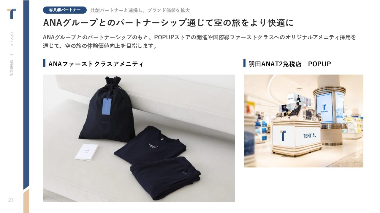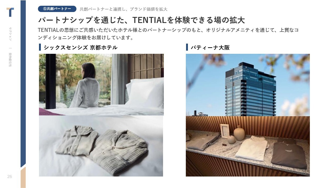 中西:アスリートだけでなく、ホテルなど「TENTIAL」を体験いただける場も拡大しています。「シックスセンシズ 京都」というラグジュアリーなビジネスホテルでは、全館に当社のパジャマを導入いただいています。このように、「TENTIAL」のブランドや商品を体験いただける場所の拡大を進めています。