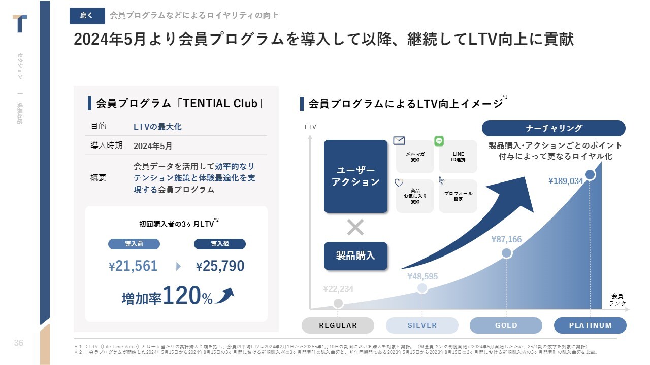中西:商品改善に関連して、2024年5月より会員プログラムを導入しました。お客さまを分析し、お客さまに対するアクションを分類しながら、よりコアなファンになっていただくために日々活動しています。