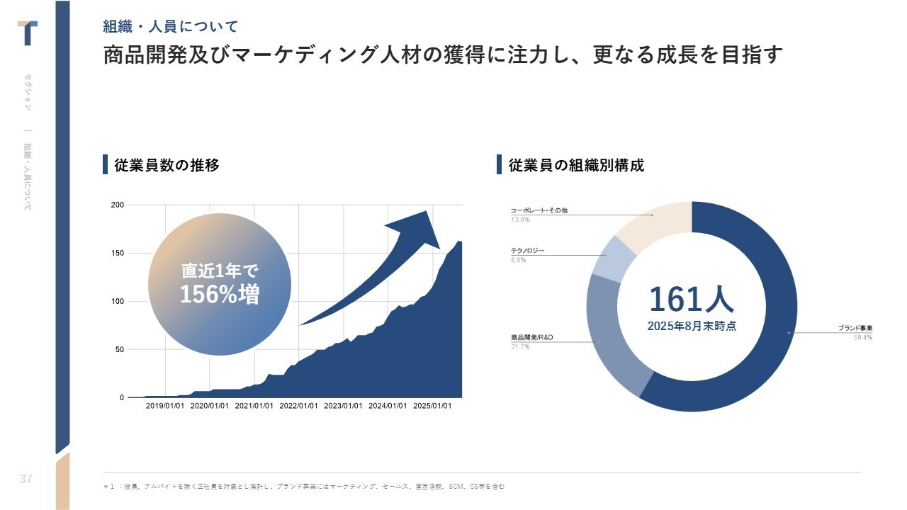 中西:組織体制についてご説明します。事業成長に伴って、従業員数は前期比で156パーセント増加しています。基本的には、事業体制と商品開発体制が大きなウエイトを占めています。
