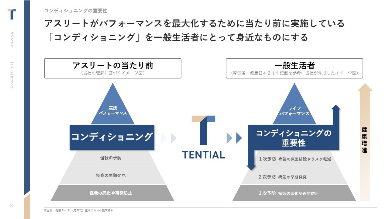 中西:このような背景から、TENTIALという社名は「ポテンシャル(potential)」を由来としています。また、当社のミッションには、人の可能性を引き出すために、健康に前向きな社会を創っていきたい、一人ひとりが健康に対して前向きになれるように事業を進めていきたいという思いが込められています。