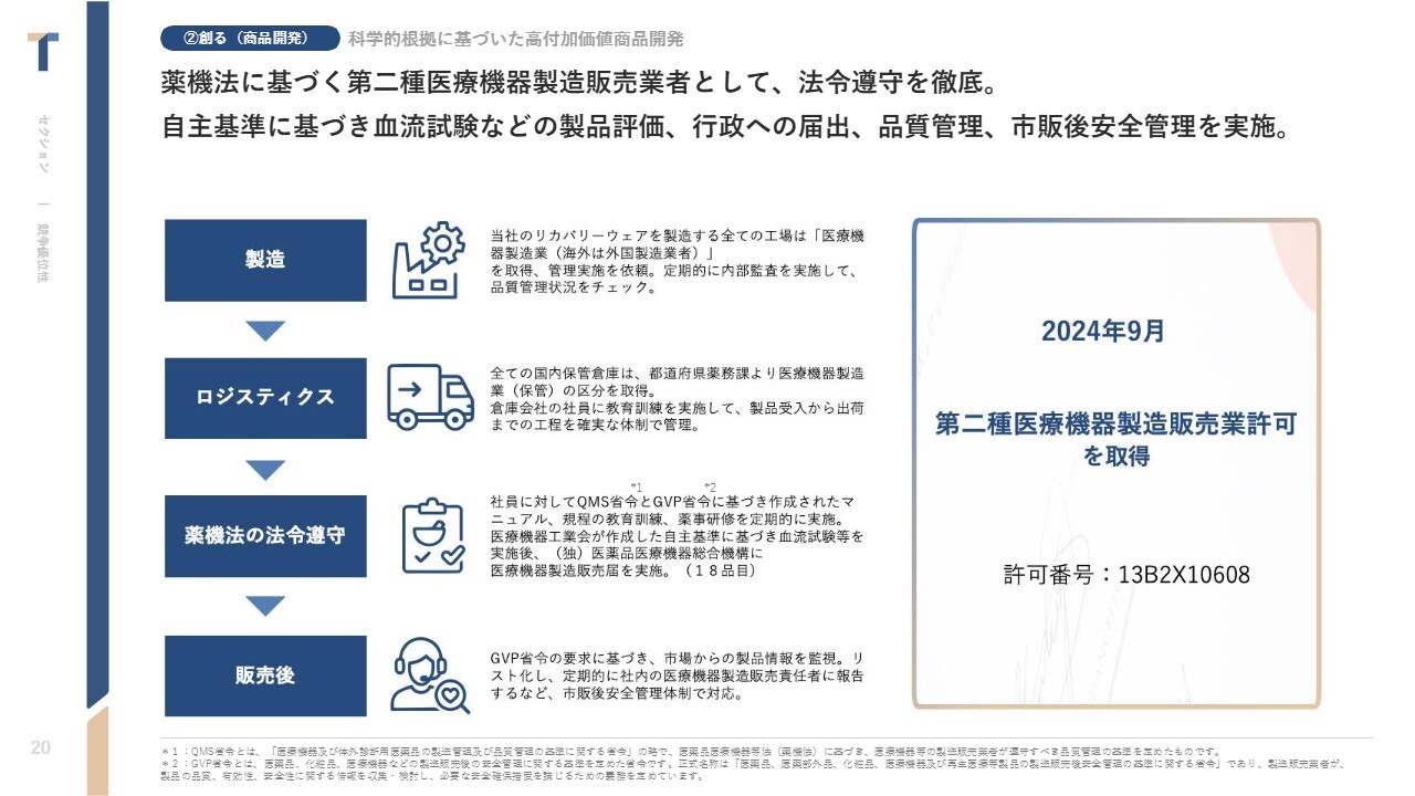 競争環境については、後ほどご説明したいと思います。なお、リカバリーウェアは一般医療機器という名称になっています。その管理体制や医療機器を扱う会社のガバナンスについても、後ほど簡単に補足します。