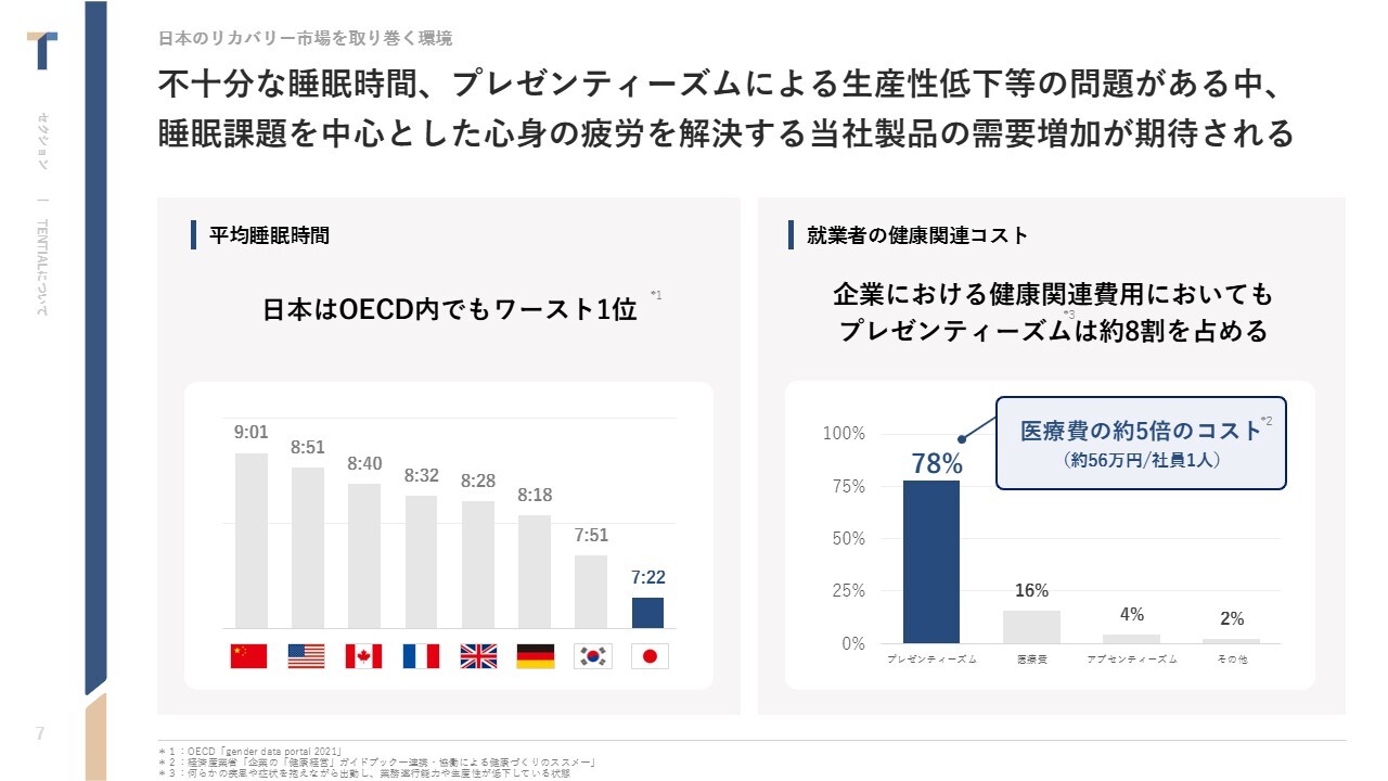 中西:社会背景についてご説明します。スライド左側は、平均睡眠時間のグラフです。先進国であるOECDの中で、日本は睡眠時間が最も短いといわれています。
