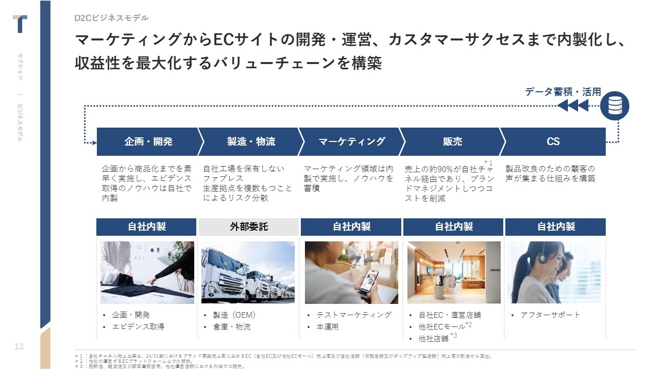 中西:ビジネスモデルを簡単に補足します。ビジネスフローは、基本的に当社で企画や開発を行い、製造や配送については外部委託しています。その他、マーケティングや販売、特にECサイトや店舗運営は、すべて内製化しています。また、アフターサポートも社内で独自運営しています。お客さまから日々寄せられる声を分析しながら商品開発や改善を行えることが、大きなポイントになっています。