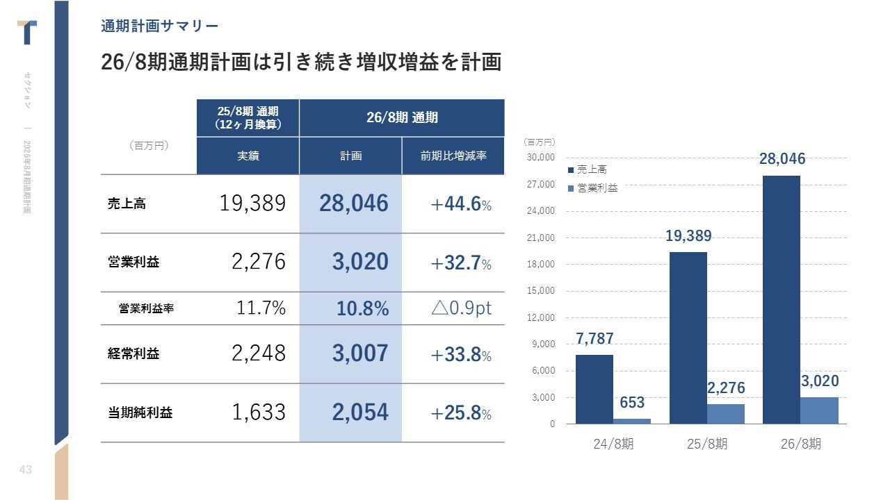 中西:2026年8月期の通期計画についてご説明します。売上高は280億4,600万円、営業利益は30億2,000万円を目標としています。売上高は前期比で44.6パーセントの成長、営業利益は前期比で32.7パーセントの成長を見込んでいます。