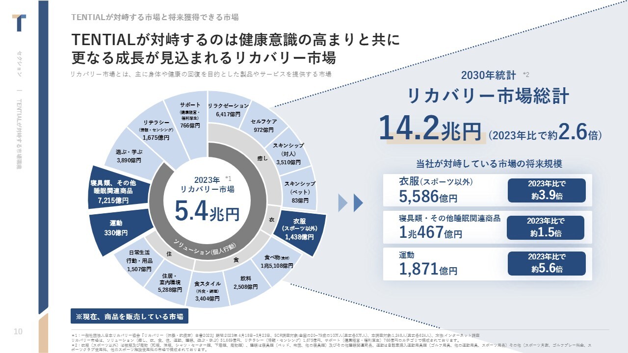 中西:TENTIALが対峙している市場についてです。当社はリカバリー市場を参照しており、いわゆる健康にまつわる投資と捉えています。その中でも、スライドの濃い青色の市場に商品を展開しています。