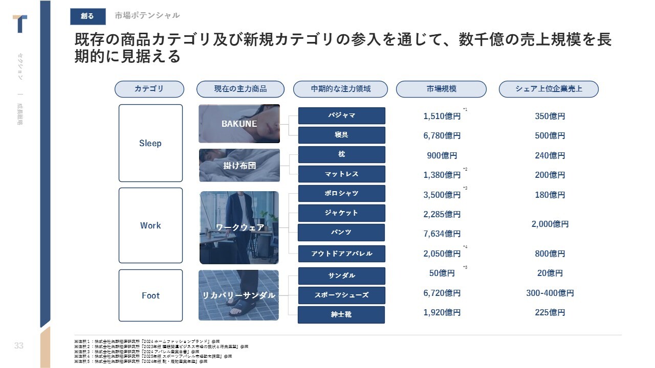 まずは寝具類・その他睡眠関連商品を強化しながら、起床・外出・移動のシーンなどにまでカテゴリを広げながら、新規カテゴリの創出につなげていきたいと考えています。