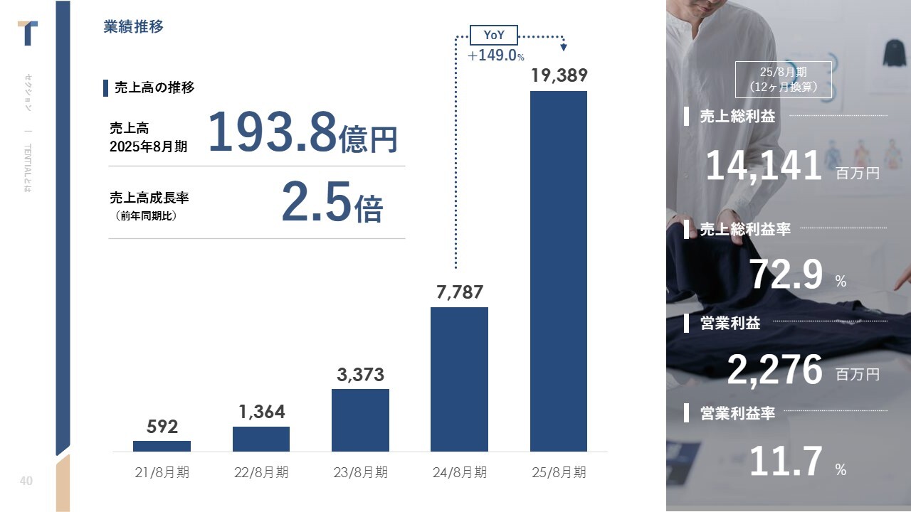 中西:8月決算に換算した2025年度の業績をご説明します。売上高は193億8,900万円で、前期比で約2.5倍の売上高成長を実現できました。