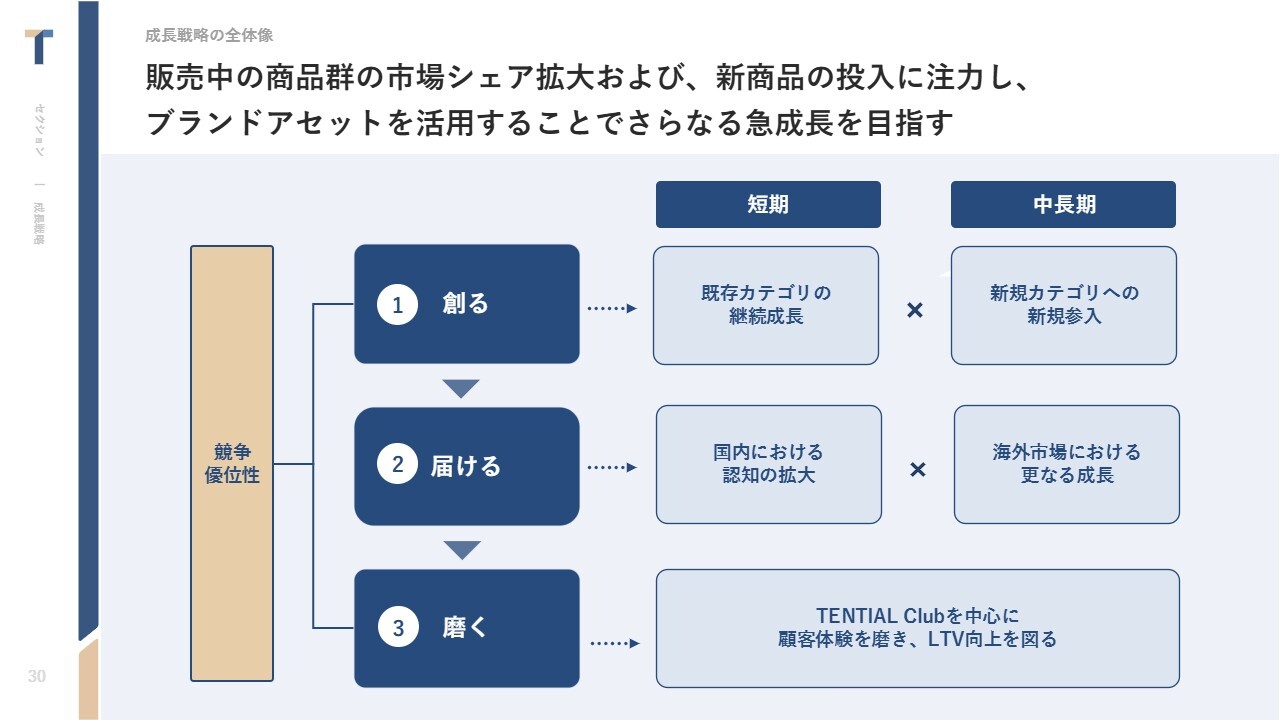 中西:成長戦略をご説明します。競争優位性のページでもお話ししましたが、本当に良いものを創って、それをお客さまにお届けしていく、そしてサイクルをしっかり磨いていく、このシンプルな3ステップで考えています。